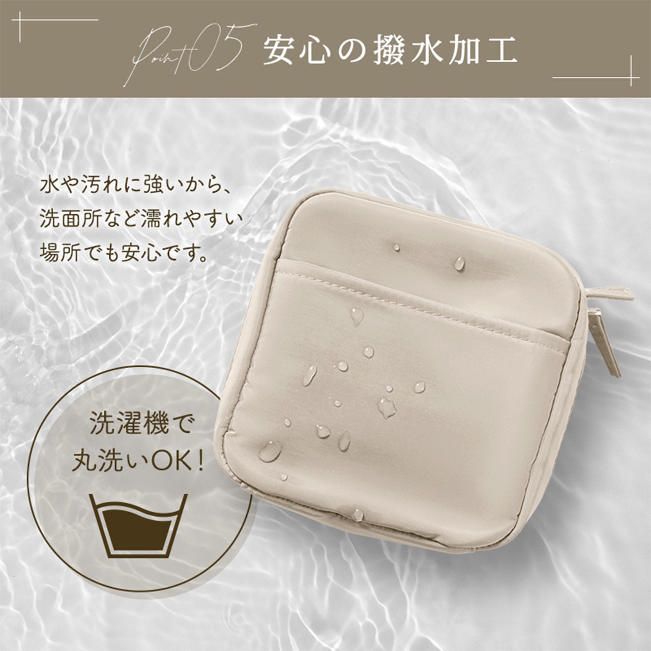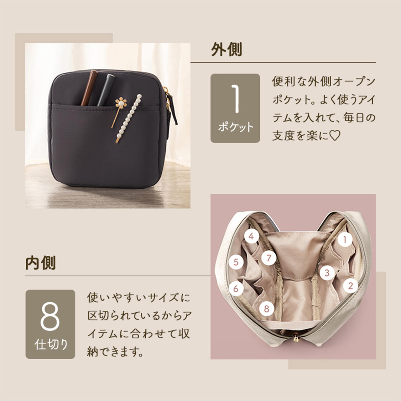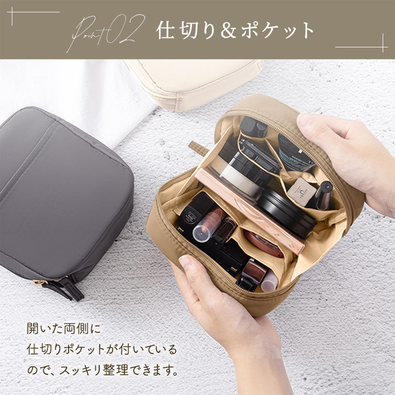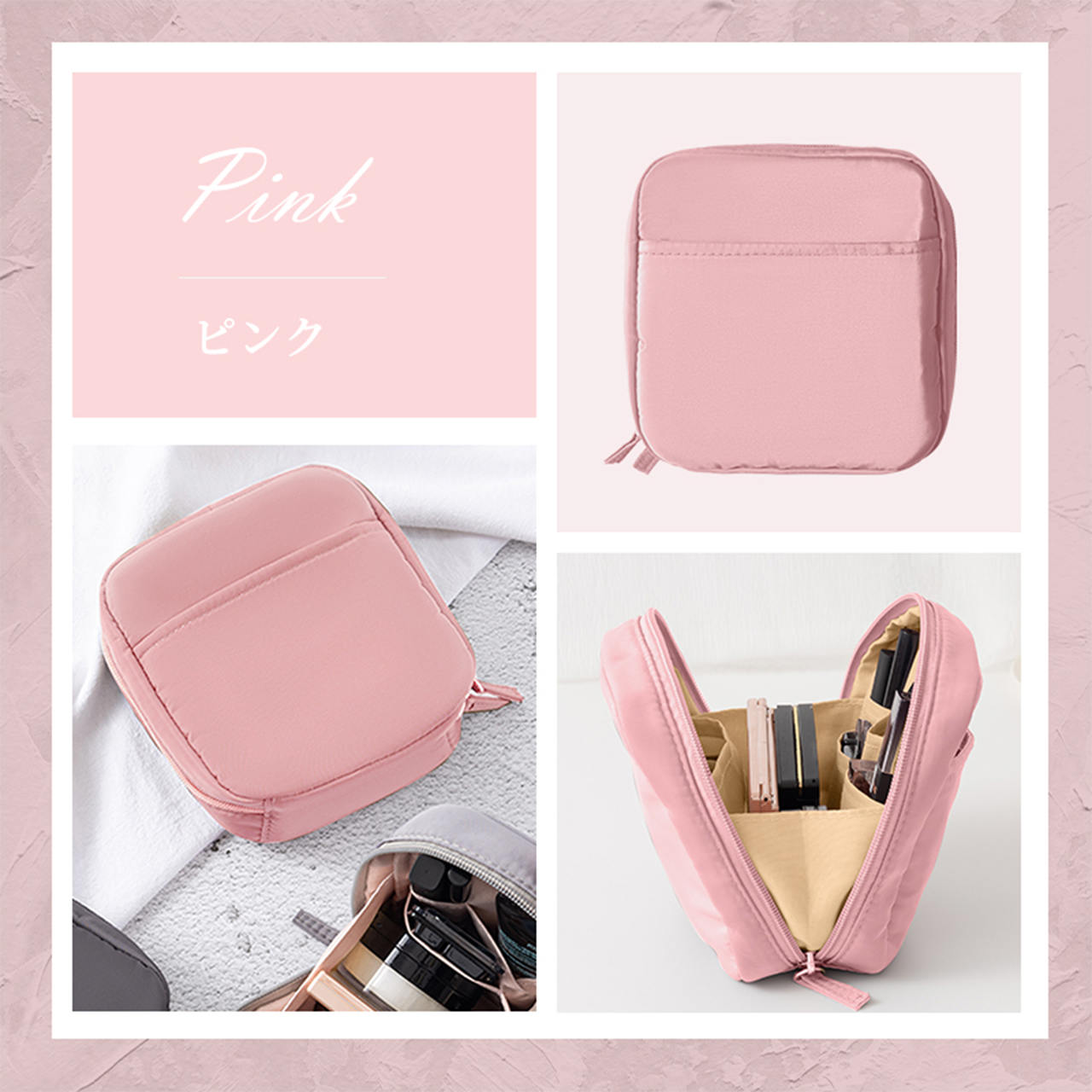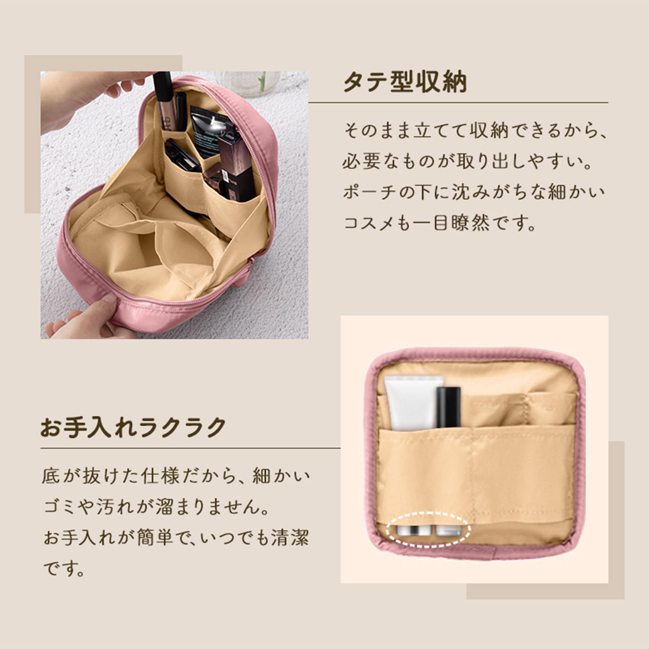 大きめの化粧ポーチを探していて、収納しやすそうなこちらを選びました。普段からたくさん持ち歩くわけではありませんが、常備薬なども一緒にしまえて良かったです。仕切りやポケットがあるので、中で迷子にならず、自立するので出し入れもしやすく買って良かったなって思います。