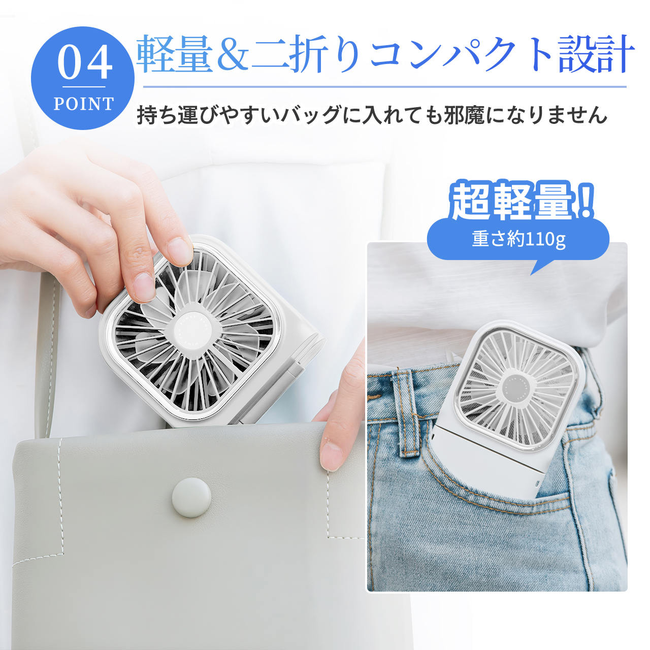 軽くて折りたたみできて持ち運びに良さそうです。風量も調節できます