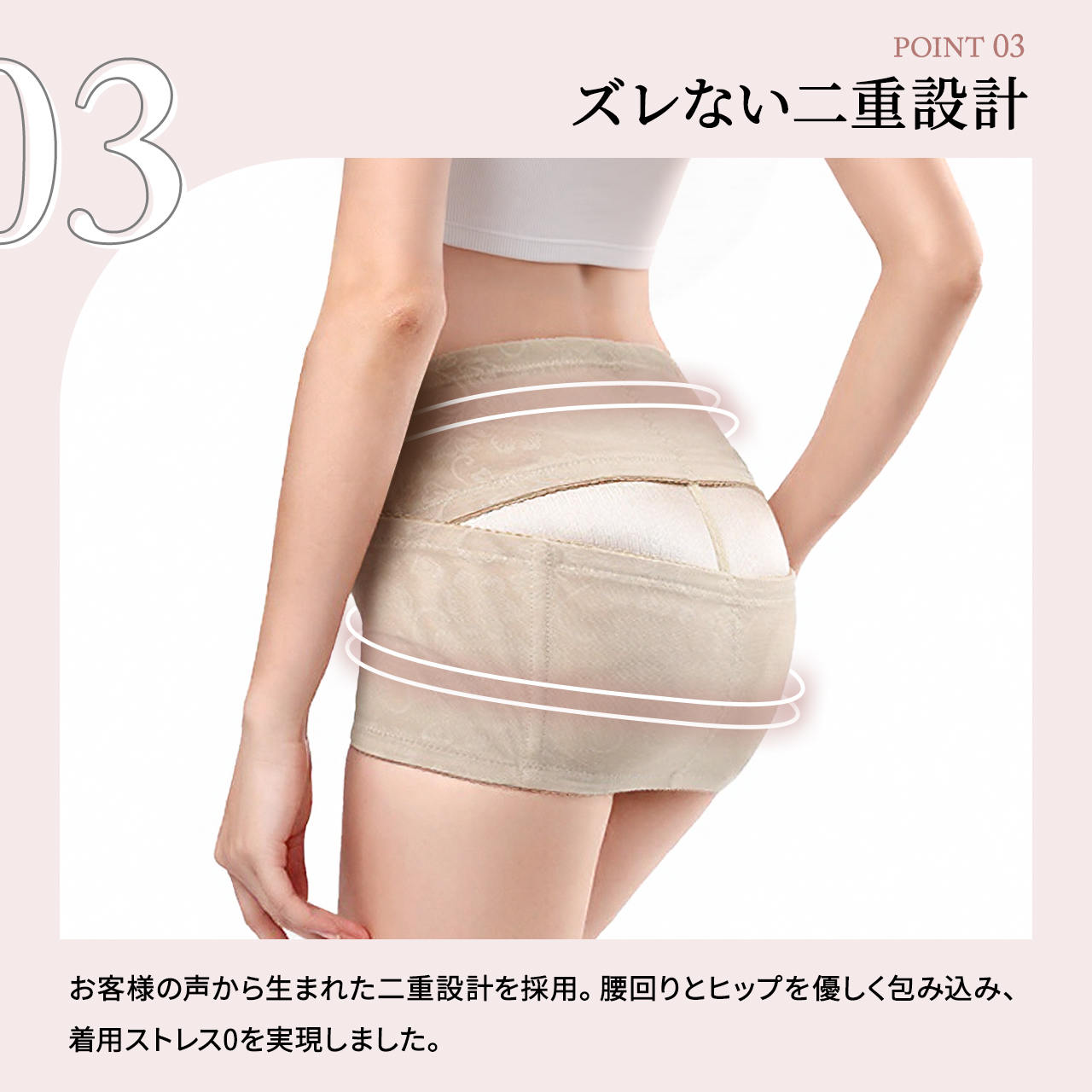 ちょうどいい位置がなかなか掴めず、間違ったところに付けてしまうと逆にお肉がモリッとなってしまうのですが、骨盤も固定されていい感じです。